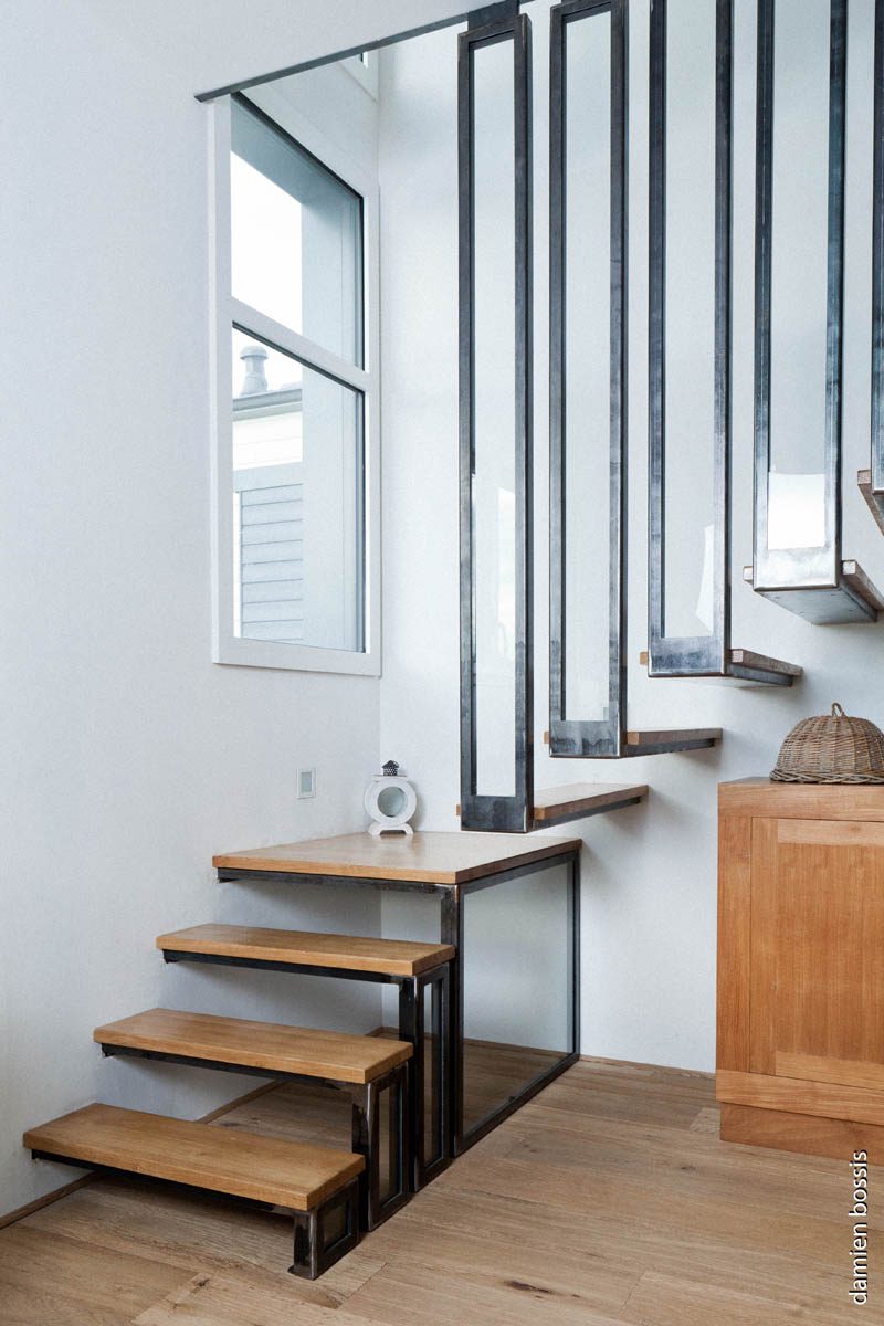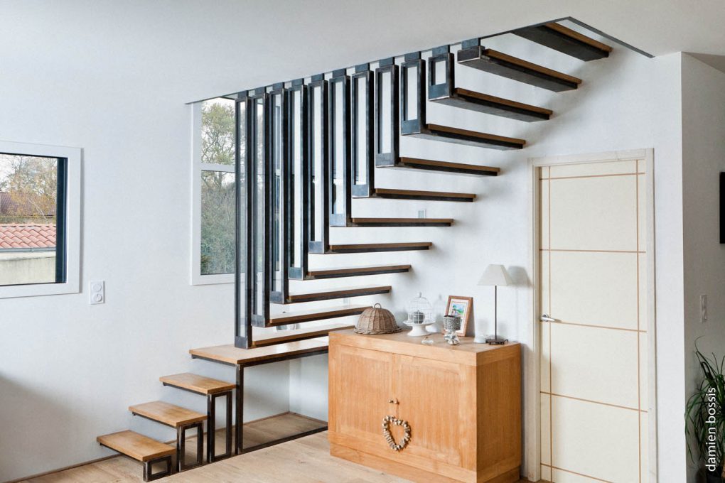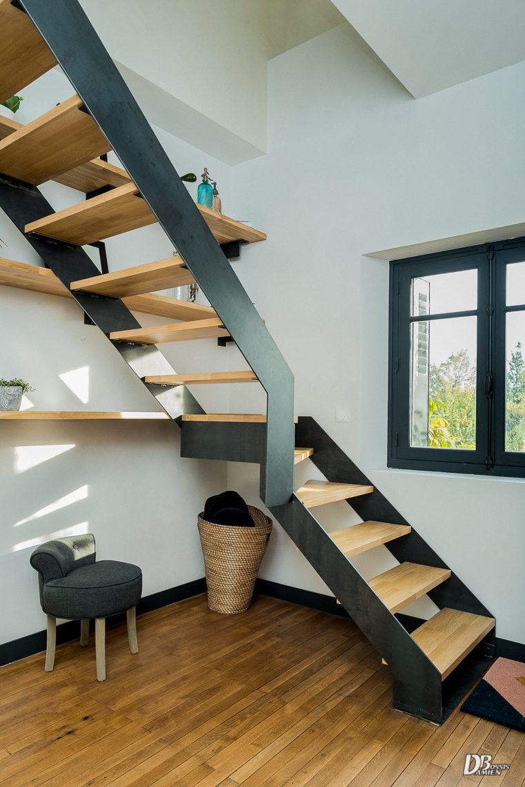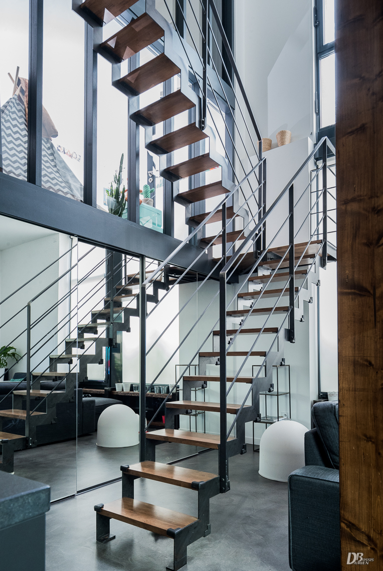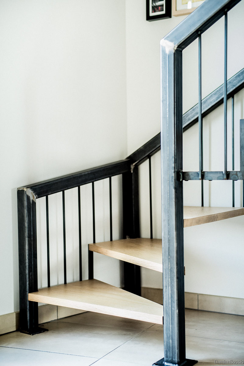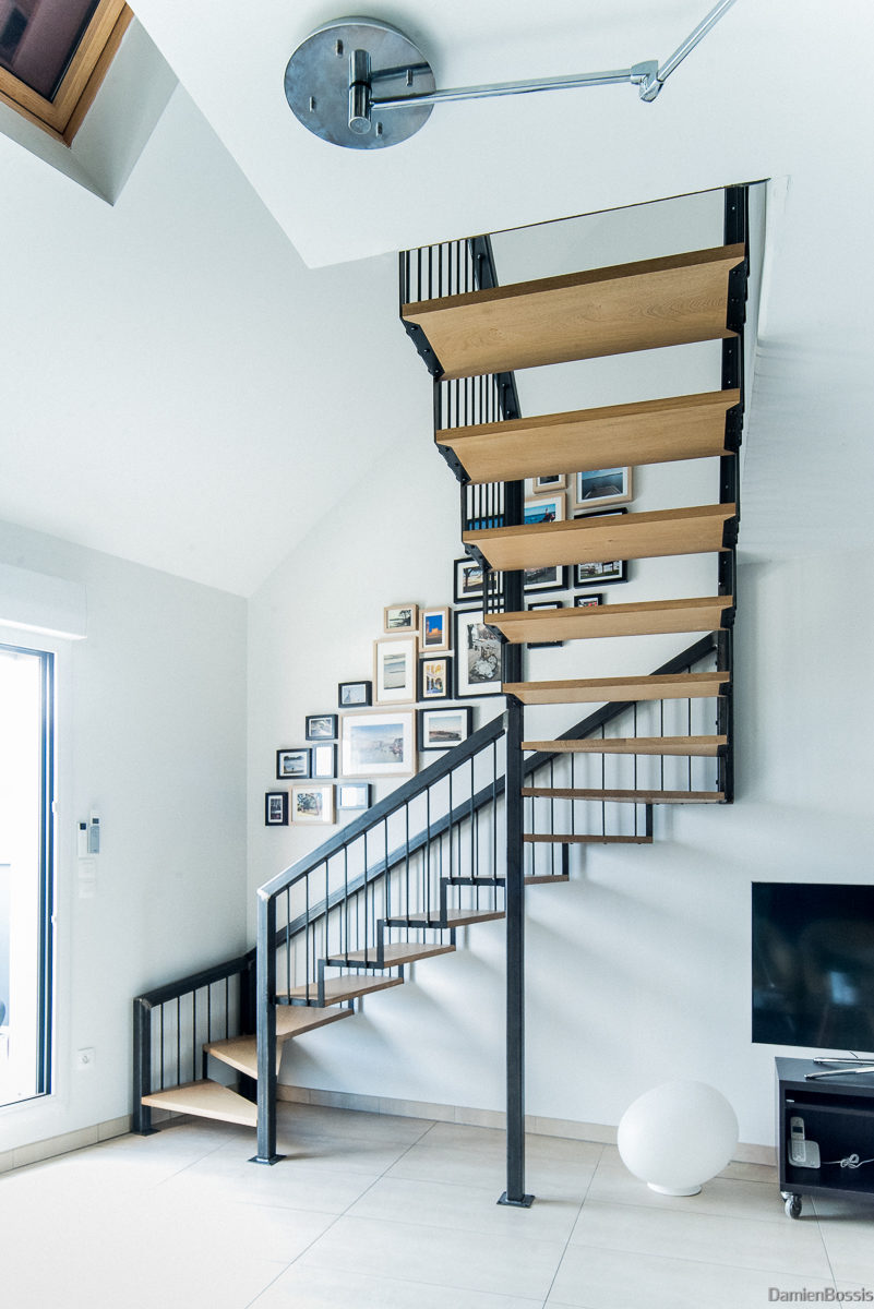 Escaliers quart tournant aux finitions plurielles : acier huilé et bois vernis, verre feuilleté, avec ou sans garde-corps…