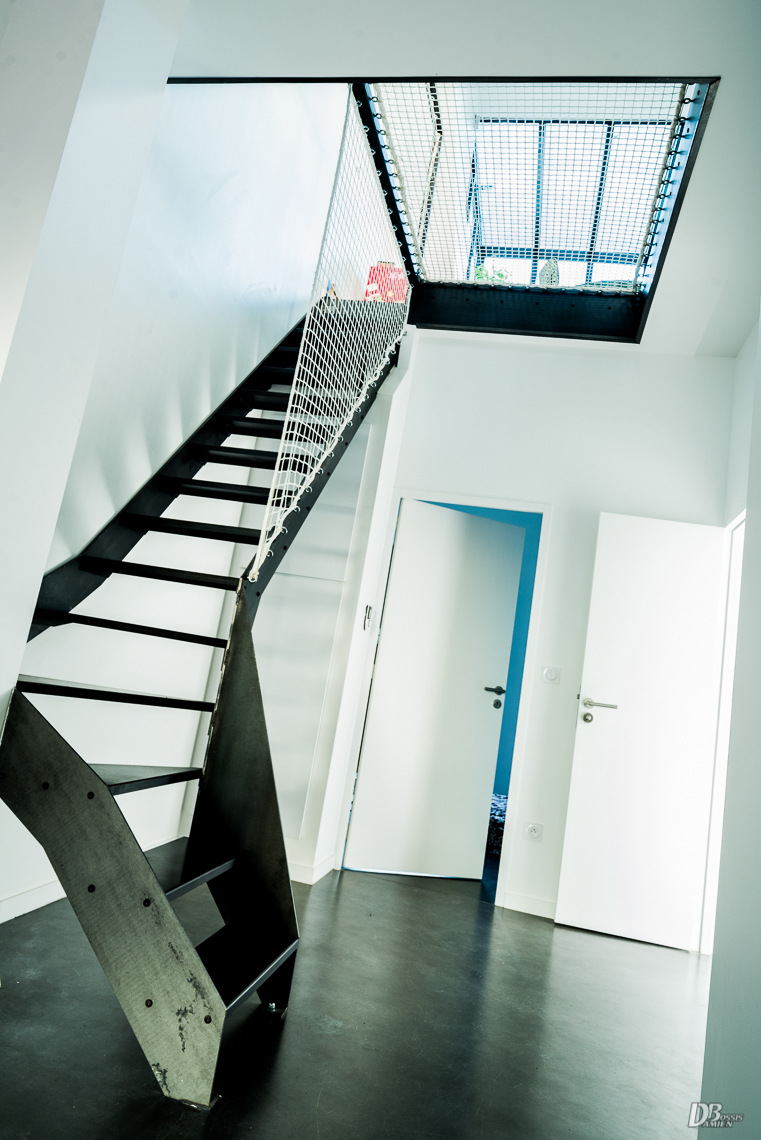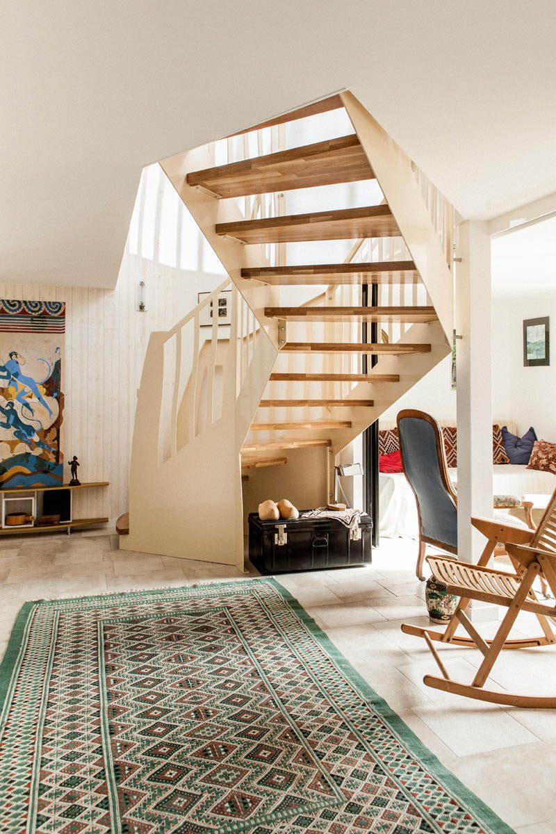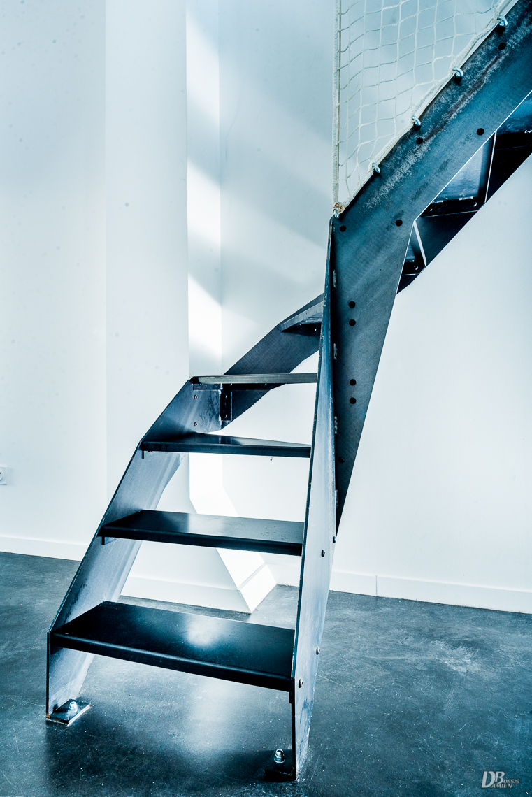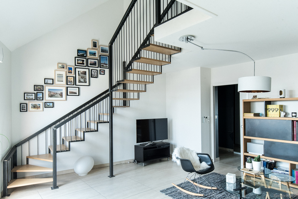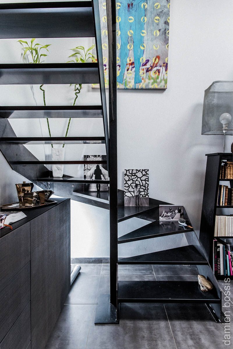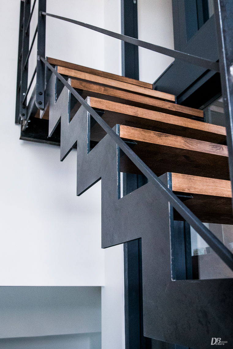 Escaliers quart tournant aux finitions plurielles : acier huilé et bois vernis, verre feuilleté, avec ou sans garde-corps…