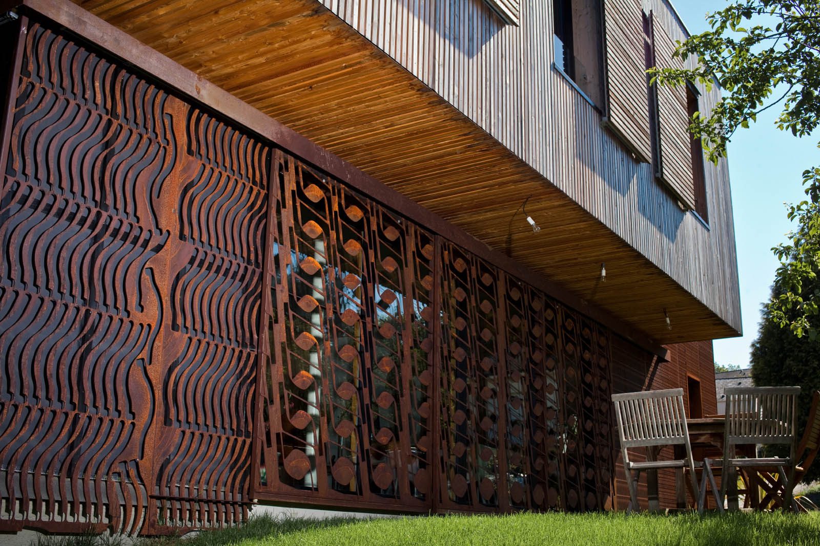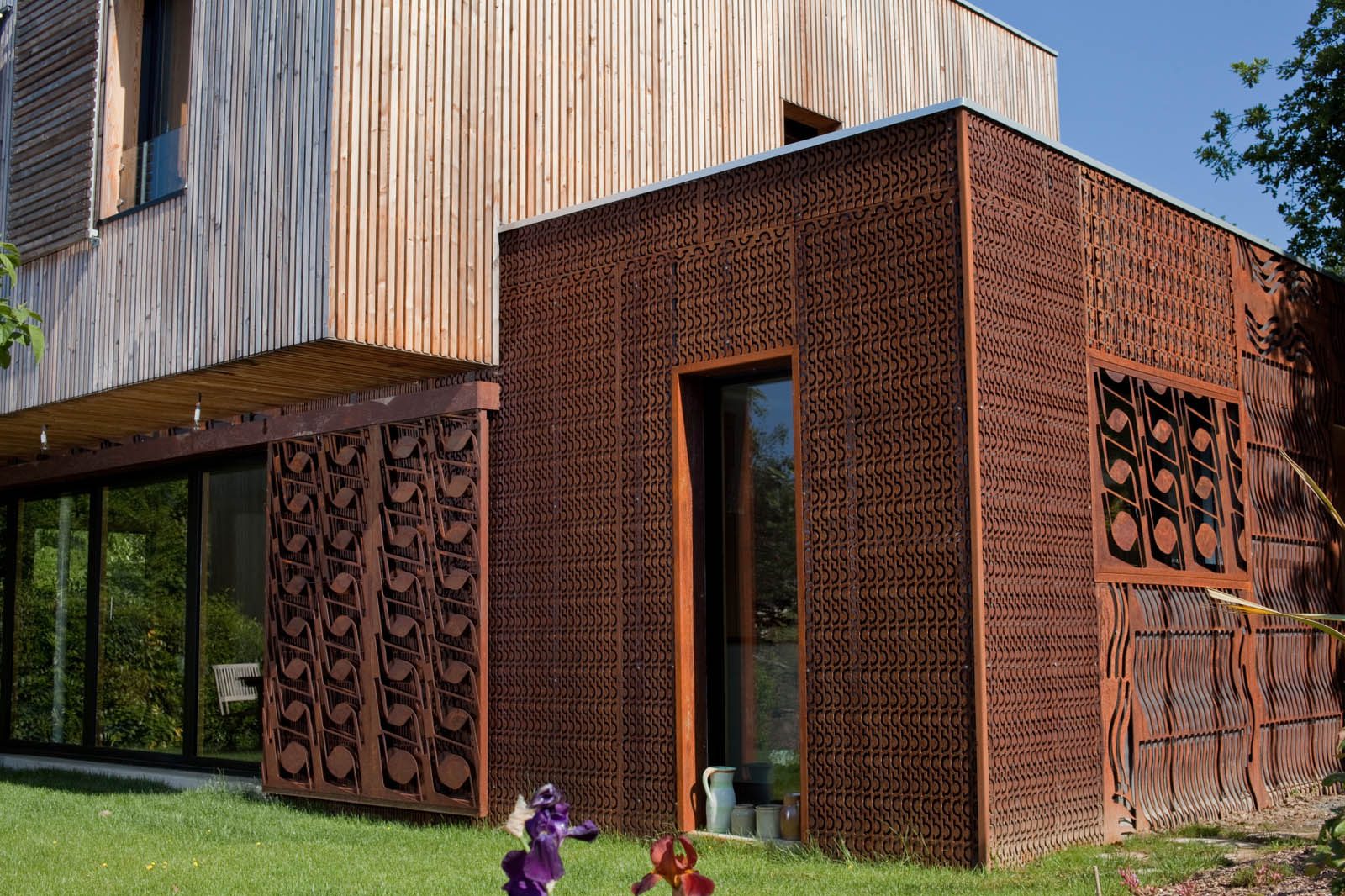 Extérieur : bardage en acier, la tôle devient graphique, bicolore, ou intègre des éléments en acier thermolaqué