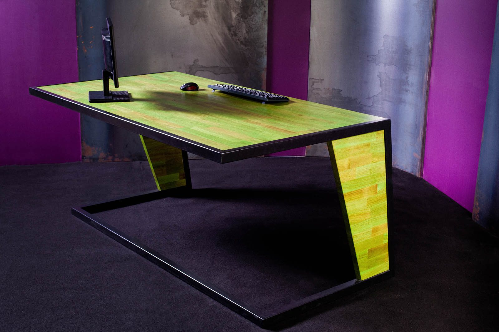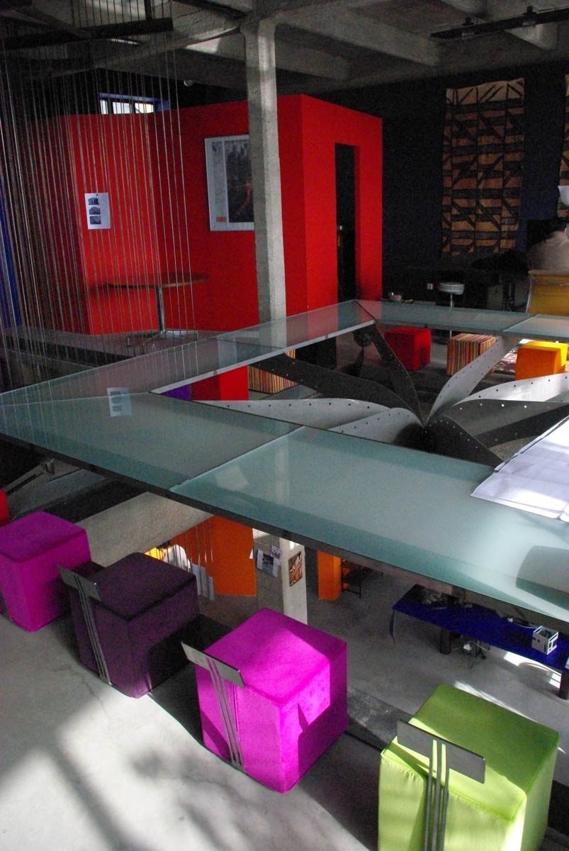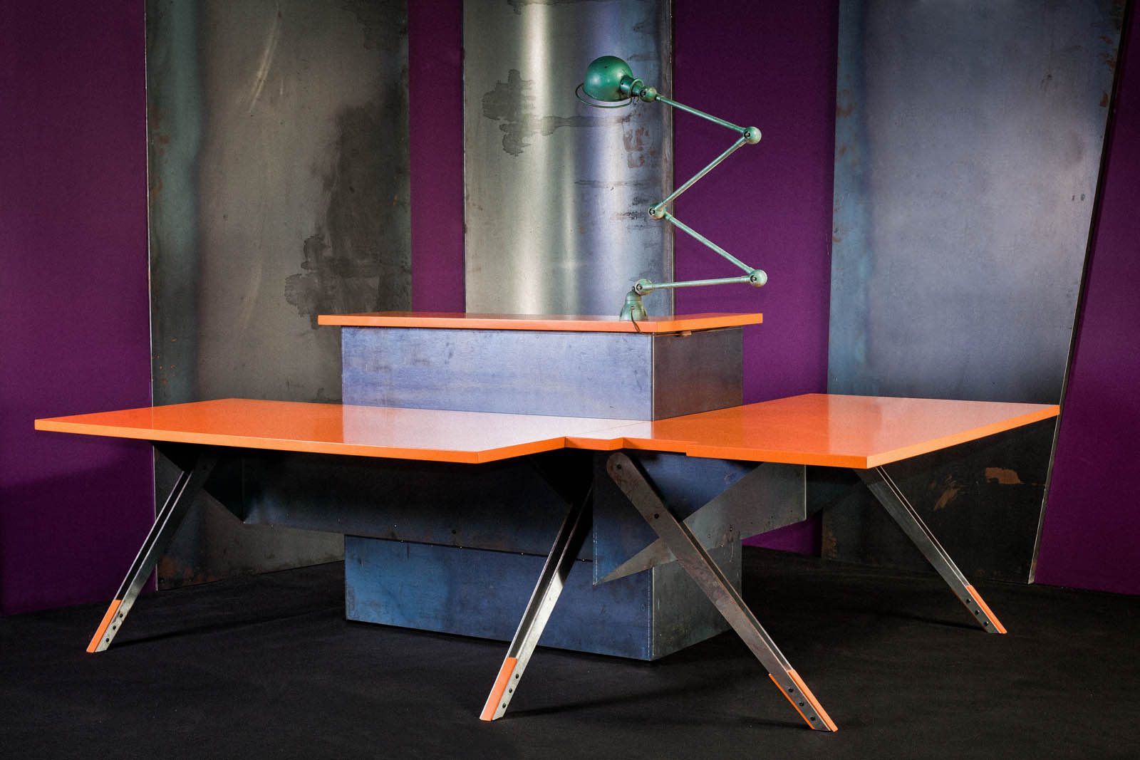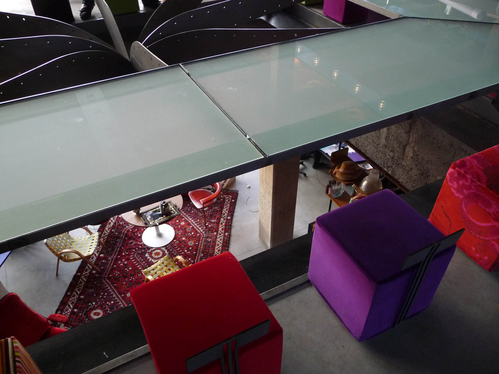 Mobilier de caractère, table de réunion suspendue bureaux au plateau médium laqué, verre sablé ou tout acier, bibliothèques et meubles sur-mesure…